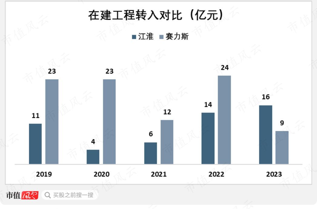 与赛力斯对比来看,江淮的设备更新进展缓慢。从在建工程转固可以看到,赛力斯早在2022年未改名之前就积极进行设备等资产更新,每年在建工程转固基本在20亿元以上。