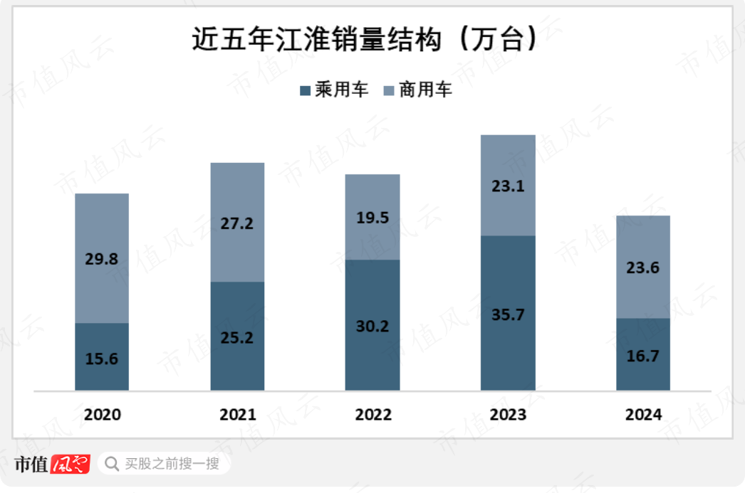 在此期间,江淮的商用车销量基本保持稳定输出,2024年为23.6万辆,其乘用车与商用车的销量占比为6:4,基本回到了2020年的状态。