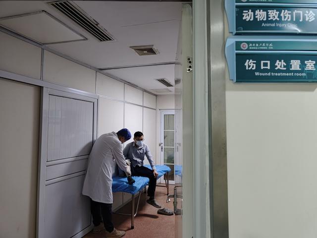 (▲湖南省人民医院动物致伤门诊接诊医生查看伤者情况)