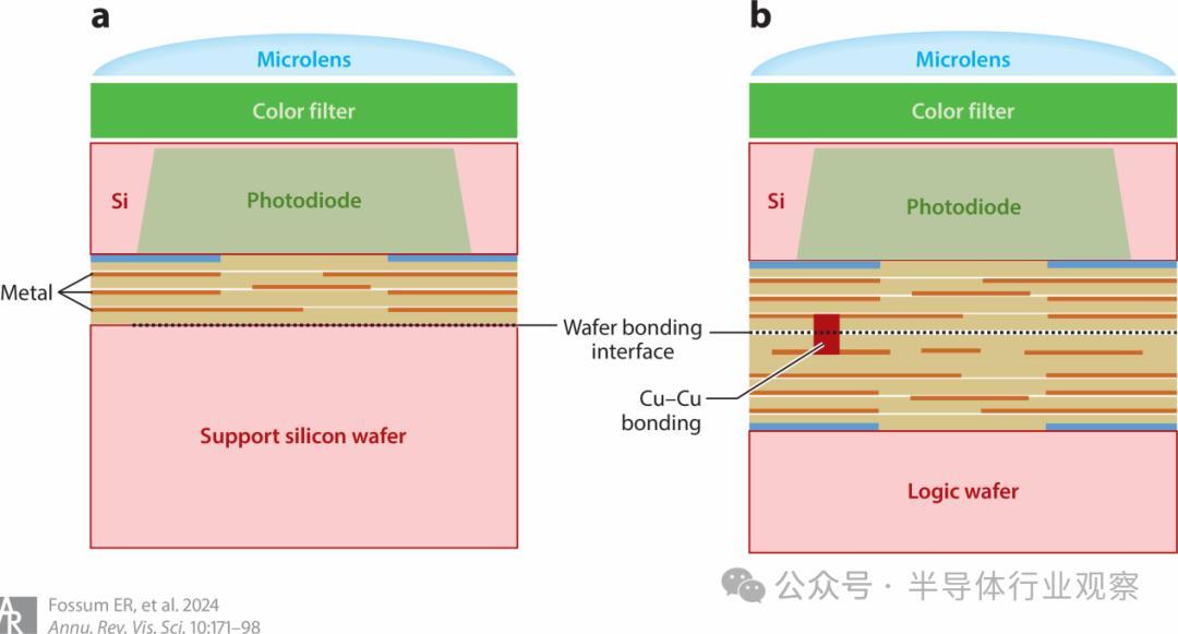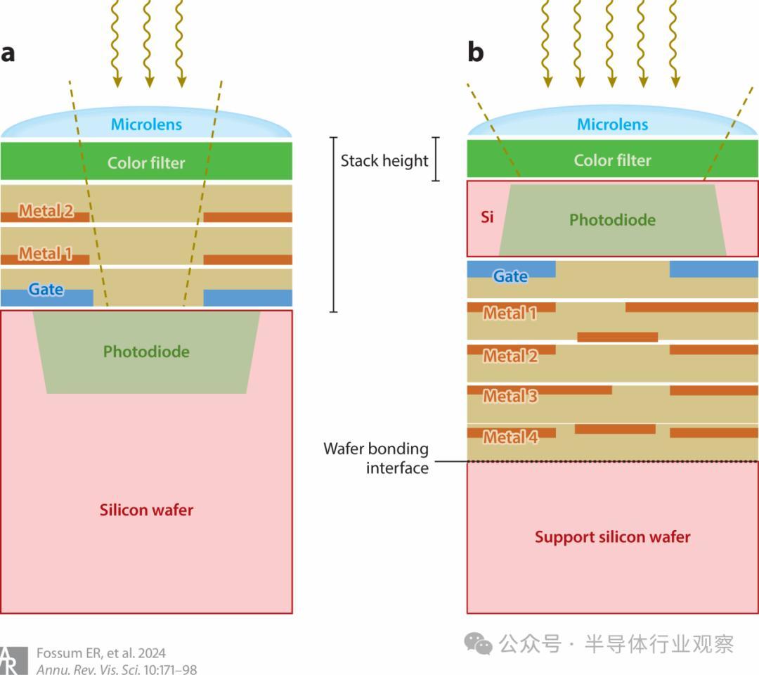 图 9 :(a) 背面发光器件和 (b) 三维堆叠图像传感器(下层用于附加电路)的横截面对比示意图。