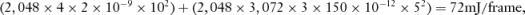 原则上,CCD 是数百万个 MOS 电容器的集合体。这些 MOS 电容器是在 SiO2(-Si3N4)栅极电介质上通过多晶硅栅极制成的。在前面 3K × 2K 像素阵列的例子中,像素间距为 12μm,垂直传输相的电容值为 2 nF/相,而水平传输相的电容值为 150 pF/相(Theuwissen 等人,1998 年)。这些电容需要充电和放电(例如,垂直时钟在 0 V 至 10 V 之间,水平时钟在 0 V 至 5 V 之间),这就增加了总的能源成本。每帧所需的传输相位能量为[使用公式能量(E)=电容(C)×电压(V2)]。