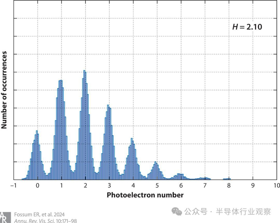 图 12 :测量到的光子计数直方图(出现次数与归一化读出电压的关系),显示出明显的光电子量化。峰高对应于平均光电子到达率 H 为 2.1 e-/样品的泊松分布,峰宽则与残余读出噪声有关。图改编自 Ma 等人(2017)。