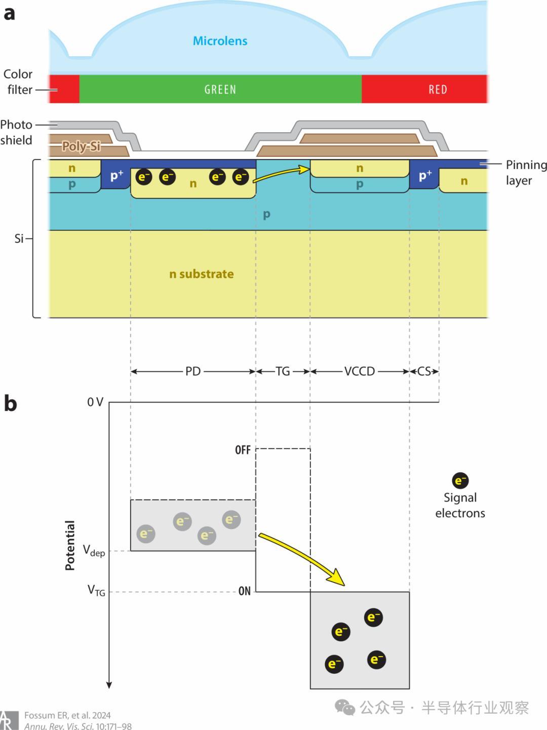 图 3 :线间转移 CCD 中的引脚式 PD,图中显示了 CCD 移位寄存器 (VCCD) 的一个相位。(a) 物理横截面和 (b) 显示电子从 PD 转移到 VCCD 的电位图。缩写:CCD,电荷耦合器件;CS,通道截止;PD,光电二极管;TG,转移门;VCCD,垂直 CCD。