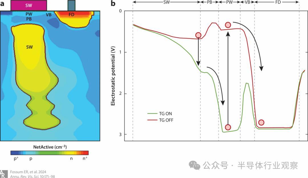 图 11 :具有超低感测节点电容的泵栅 jot 器件。(a) BSI 像素的横截面。(b) 沿像素内电荷转移路径的静电势。面板改编自 Ma & Fossum (2015)。缩写:BSI,背面发光;FD,浮动扩散;PB,p 型体硅;PW,p 型阱;SW,存储阱;TG,转移栅;VB,虚拟势垒。