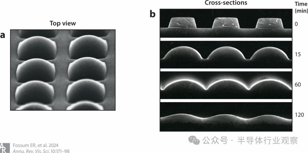 图 4 微透镜将光线集中在像素的光活性区域。(a) 俯视图。(b) 不同热流时间的截面图。图片由 NEC 公司提供。
