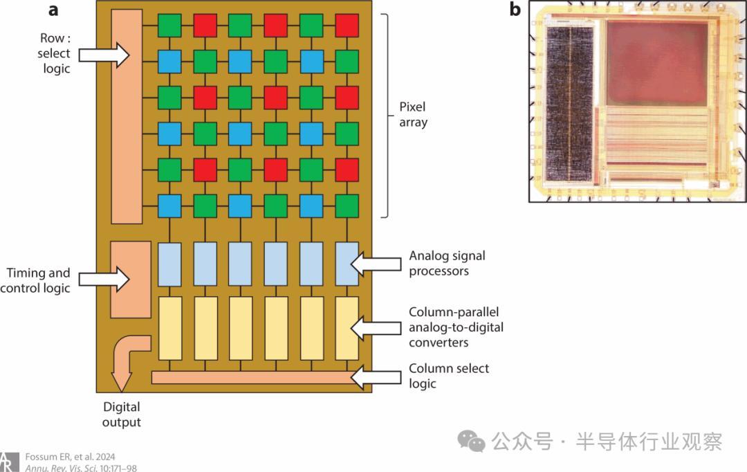 图 6 :(a) 互补金属氧化物半导体 (CMOS) 图像传感器框图。(b) 用于网络摄像头的早期 Photobit CMOS 图像传感器芯片照片。(左图)用于控制和输入输出(I/O)功能的数字逻辑。(右上)像素阵列。(右下)列并行模拟信号处理和模数转换器 (ADC) 电路。照片由 E.R.F. 提供。