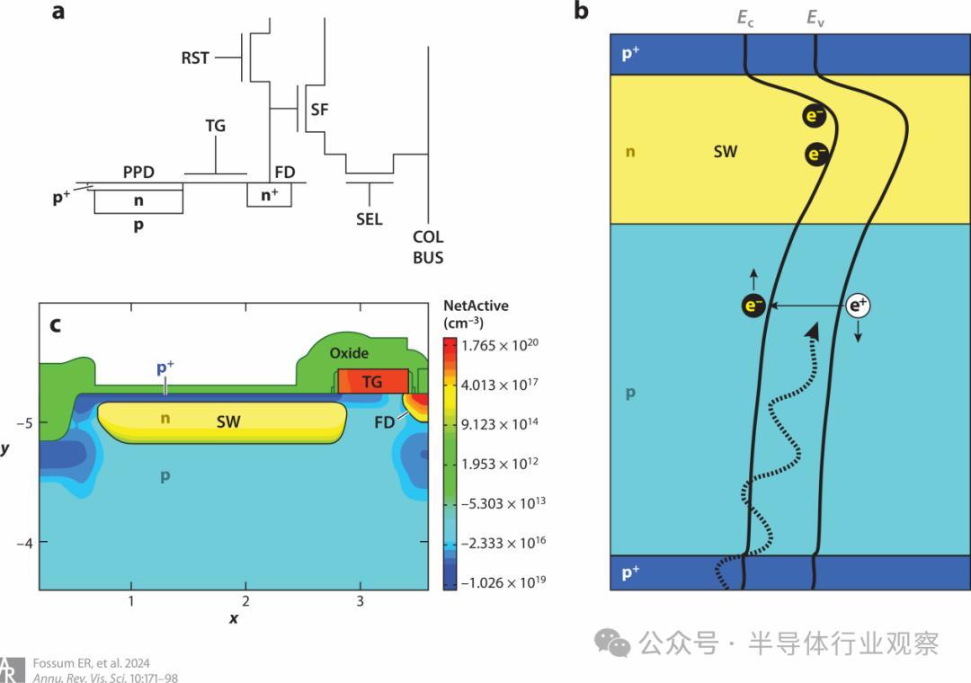 图 7 :具有像素内电荷转移功能的 PPD 4-T 有源像素示意图。(a) 电路原理图(Fossum 和 Hondongwa,2014 年)。(b) 垂直穿过 PPD 的带状图,显示光子、电子-空穴对和 SW。(c) 显示掺杂水平的物理横截面图(Fossum 2023)。缩写:COL BUS,列总线;FD,浮动扩散;PPD,引脚光电二极管;RST,复位栅极;SEL,选择栅极;SF,源极跟随器;SW,存储阱;TG,传输栅极。