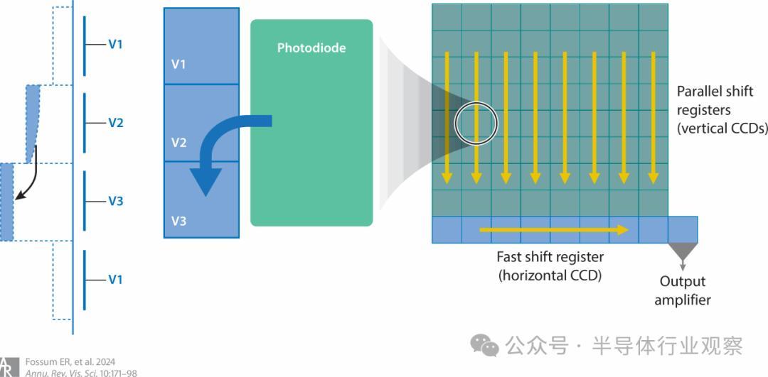 图 2 :三相线间传输电荷耦合器件(ILT)的示意图,显示(左)带有光电二极管(PD)和垂直 CCD 的单元,(右)整个 ILT CCD 图像传感器。光信号从光电二极管进入垂直 CCD,然后进入水平 CCD,最后到达感应节点和输出放大器。