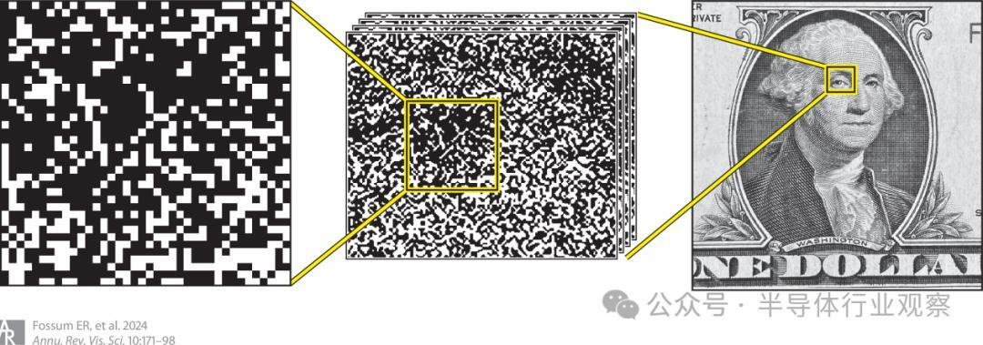 2005 年,有人提出了一种不同的图像传感器方法,即由大量以高帧频运行的专用微小像素(称为 jots)对单光子进行检测和计数(Fossum,2005 年)。1 检测基本上是二进制的:0 表示没有光子,1 表示有光子。多帧二进制数据可用来再现灰度图像,如图 10 所示。单光子灵敏度意味着可以在最暗的光线下成像。这一概念最初被称为数字薄膜传感器,后来更名为量子图像传感器(QIS),并扩展到多比特操作(Fossum 等人,2016 年)。