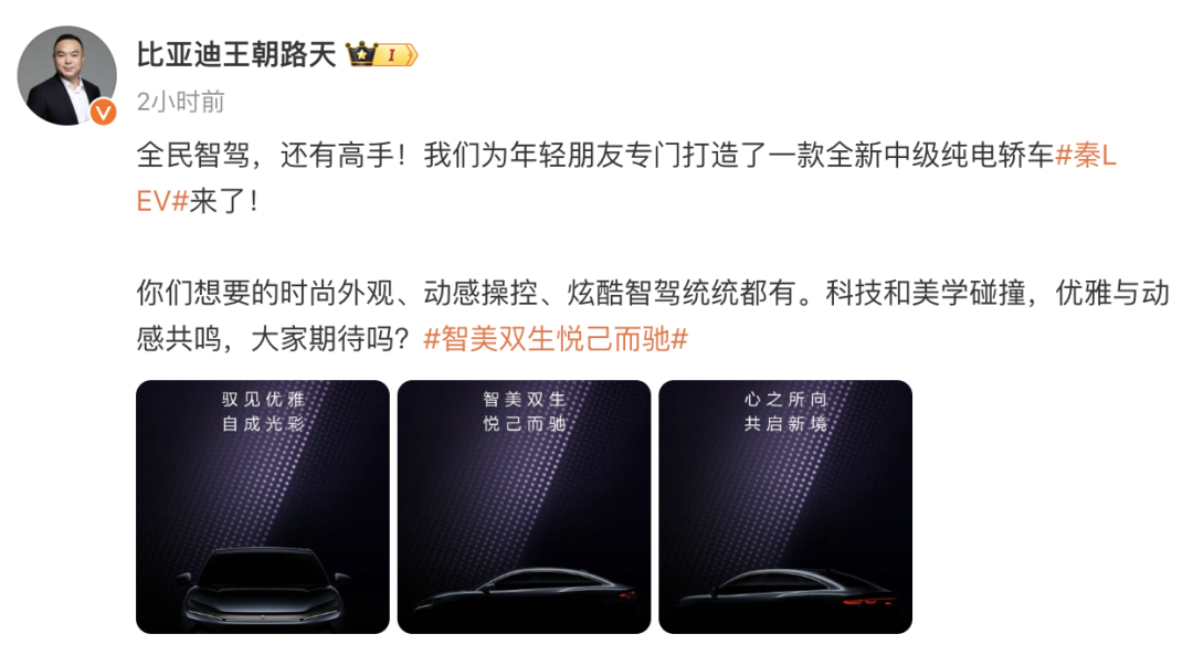 2月24日,比亚迪王朝网销售事业部总经理路天在社交平台宣布比亚迪将推出一款全新中级纯电轿车“秦L EV”,为年轻朋友专门打造,“你们想要的时尚外观、动感操控、炫酷智驾统统都有。科技和美学碰撞,优雅与动感共鸣,大家期待吗?”