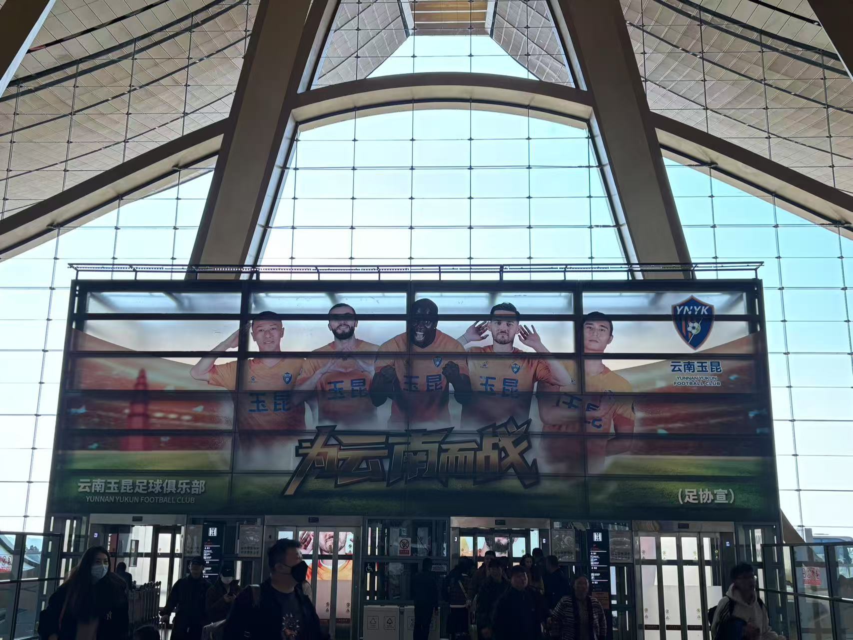 在昆明长水机场出发层的门口处,抬头便可以看到云南玉昆俱乐部的大幅宣传海报,上面有玉昆球员照片,写着“为云南而战”。