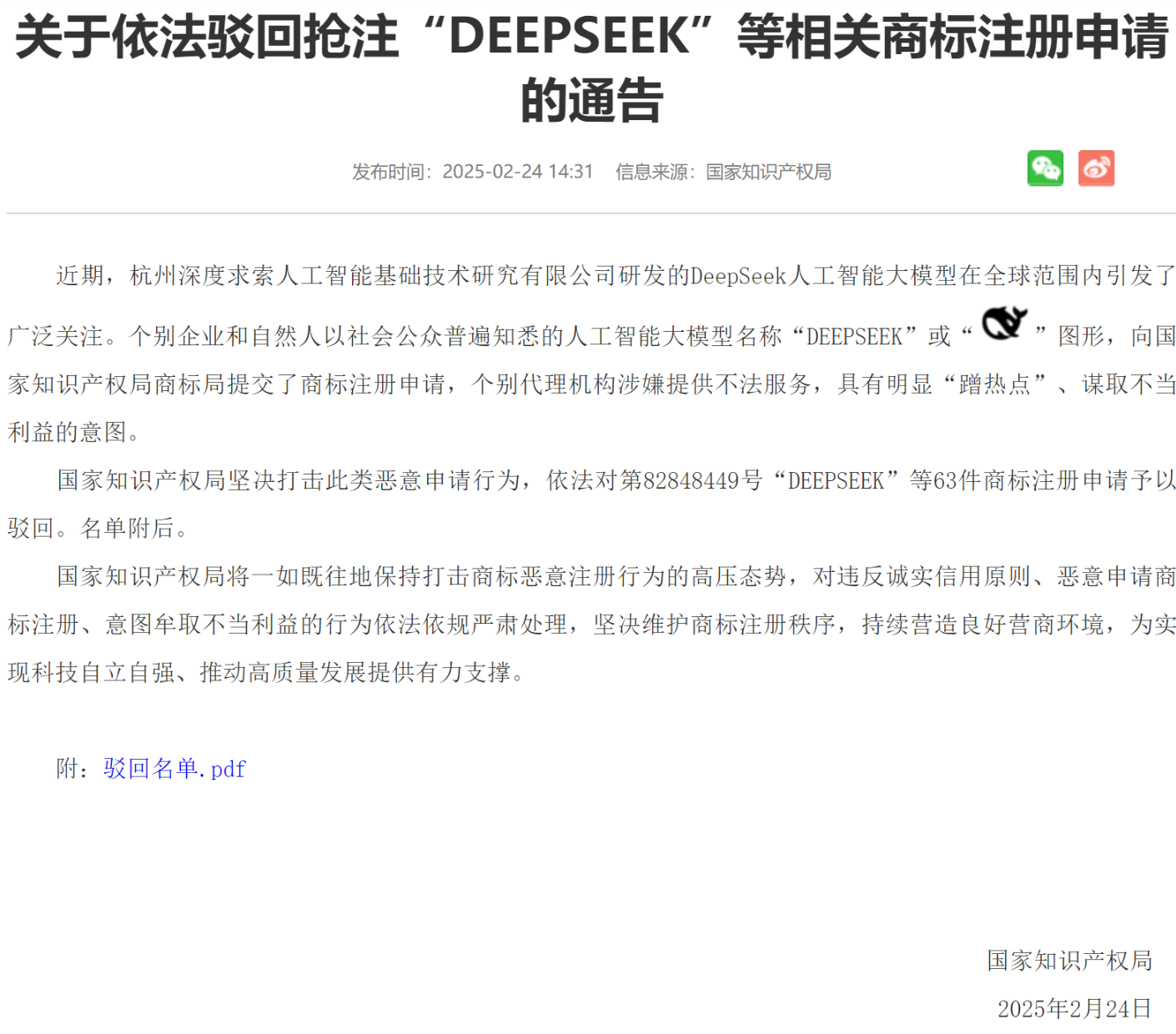 国家知识产权局坚决打击此类恶意申请行为,依法对第82848449号“DEEPSEEK”等63件商标注册申请予以驳回。