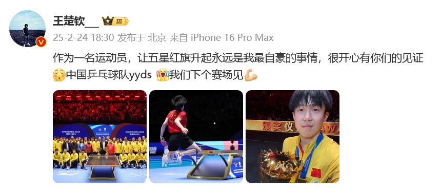24日晚,王楚钦赛后发文:下个赛场见。