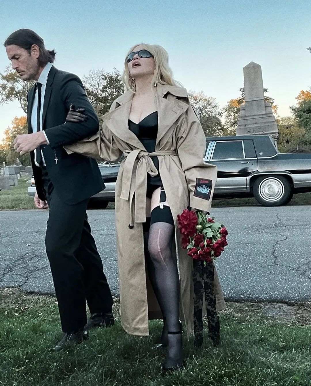 大片中,两人手牵手漫步在墓园之中,宛如刚参加完一场葬礼,营造出一种别样的氛围。