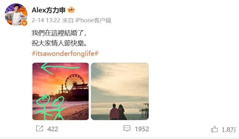 他在微博上晒出了和妻子叶萱的海滩浪漫背影照,并配文“我们在这里结婚了,祝大家情人节快乐”。