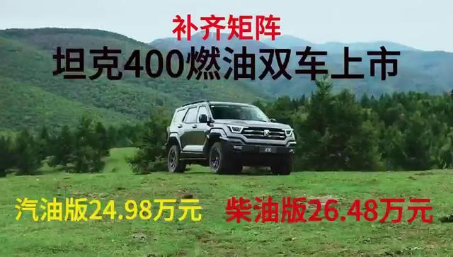 补齐矩阵,坦克400燃油双车上市,汽油版24.98万元,柴油版26.48万元。