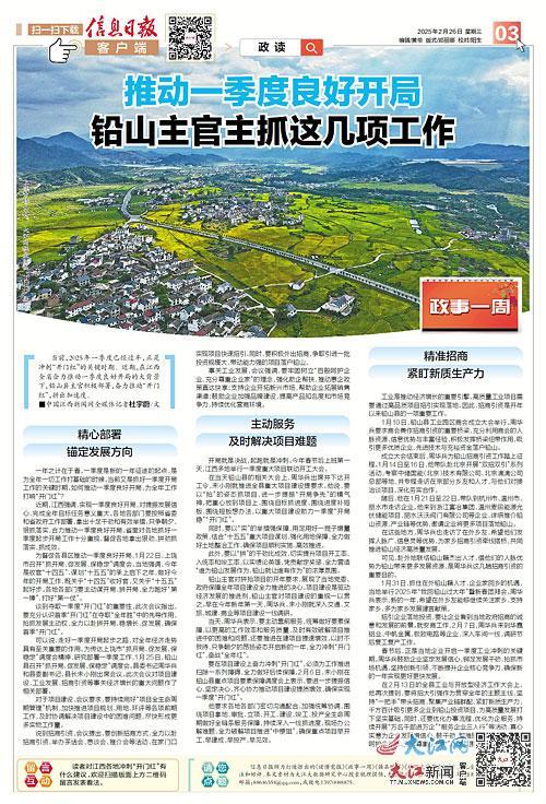 当前,2025年一季度已经过半,正是冲刺“开门红”的关键时期。近期,在江西全省合力推动一季度良好开局的大背景下,铅山县主官积极部署,奋力推动“开门红”,拼出加速度。