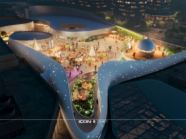 项目在建筑设计中将云中绿洲与城市森林的理念分别融入Innermall与Outmall中,以前卫的设计语言植入林、谷、田、水等自然元素形成充满线条、生机灵动的建筑形态。随着季向和空间变化形成多层级微气候自然公园,让人们在充满自然质感的商业空间中激发生活灵感。