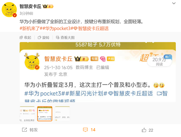 此外,还有爆料指出,华为Pocket 3将推出标准版和艺术定制版两款机型,在设计上会更薄、更小、更轻便。