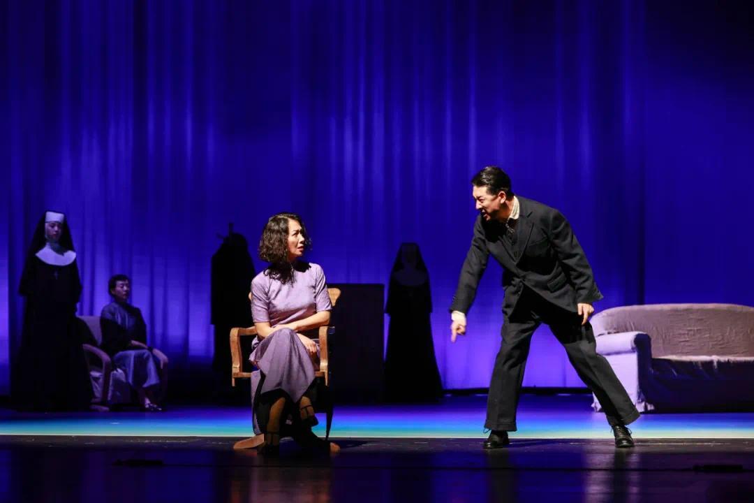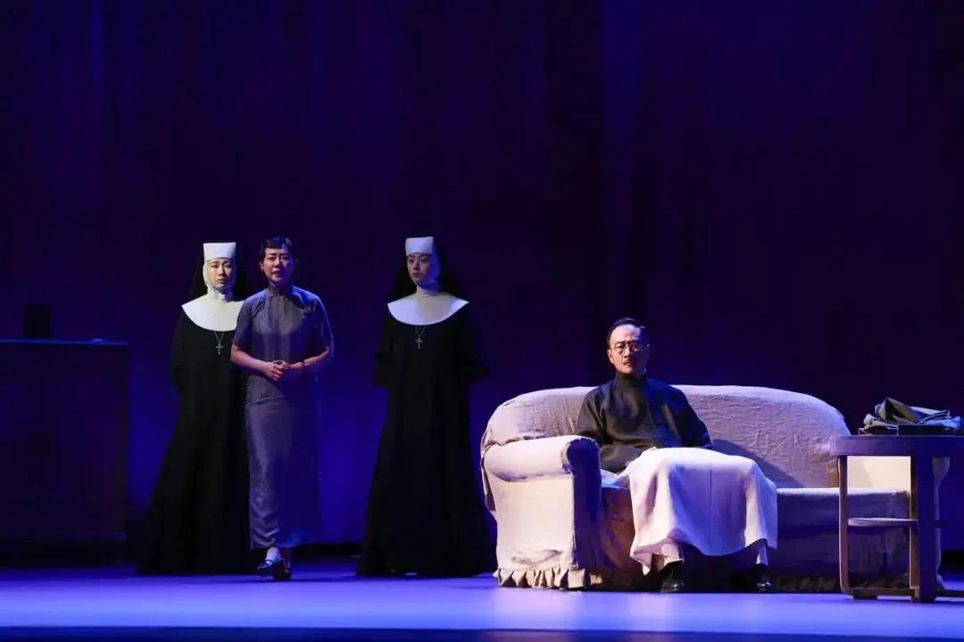 舞台上,教堂、周公馆与杏花巷的鲁贵家,始终“共用”同一空间。没有富丽奢华,没有逼仄破旧,张叔平极简的舞台设计一览无多余。落落帷幔、转椅沙发、旋旋楼梯,搭配去漆的原木桌子,显得粗质、朴拙。