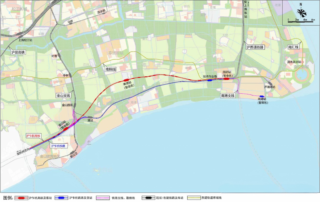 公示显示,沪乍杭高铁(上海段)、沪乍杭铁路(上海段)自沪浙省界接入上海市金山区,途经奉贤区、临港新片区至四团站,在四团站利用沪苏通铁路接入东方枢纽上海东站,并自四团站新建支线至上海港杭州湾港区临港新城作业区(简称“南港支线”)。
