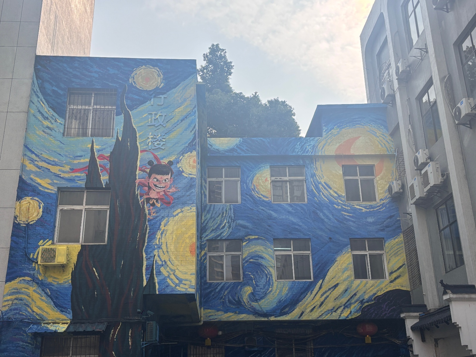 该校的潘老师介绍,这幅墙绘将鬼马精灵的“哪吒”投射到梵高的《星空》画作中去,代表了中西方思想的交融以及古典和现代艺术的碰撞。