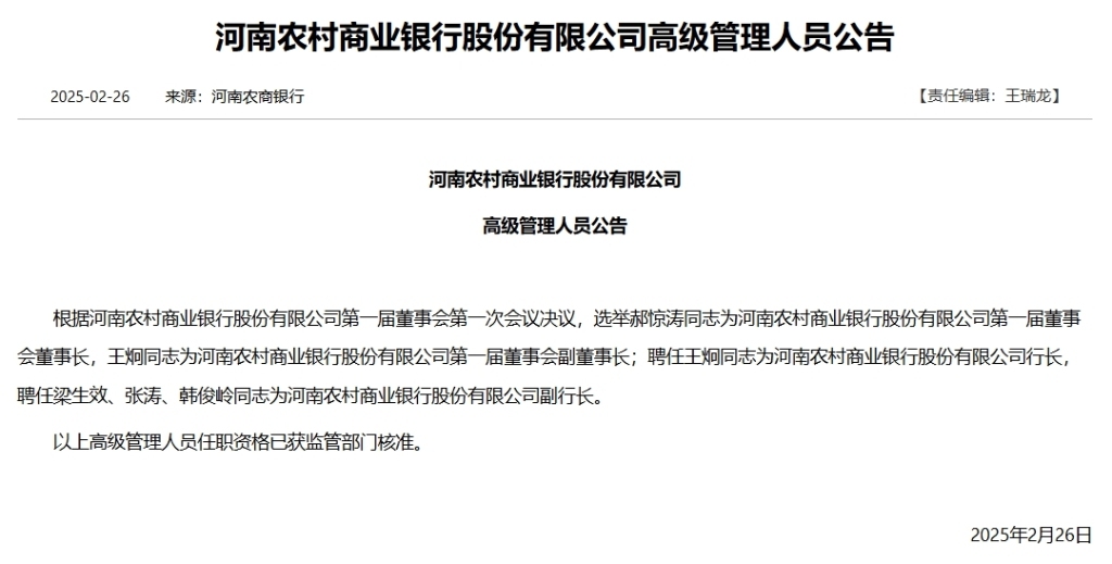 2月26日,河南农商银行公告称,选举郝惊涛为河南农商银行第一届董事会董事长,王炯为河南农商银行第一届董事会副董事长;聘任王炯为河南农商银行行长,聘任梁生效、张涛、韩俊岭为河南农商银行副行长。以上高级管理人员任职资格已获监管部门核准。澎湃新闻发现,上述5人均为原河南农商联合银行领导班子成员。