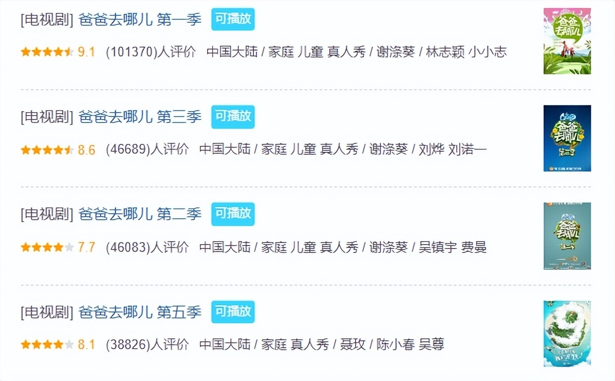 《爸爸去哪儿》第一季节目豆瓣评分高达9.1分,播出期间连续12期位列全国综艺节目收视第一。