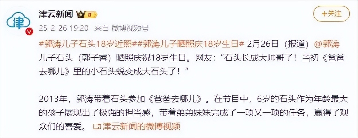 2月26日,据津云新闻,郭涛的儿子石头(郭子睿)晒照庆祝18岁生日,引发广泛关注。