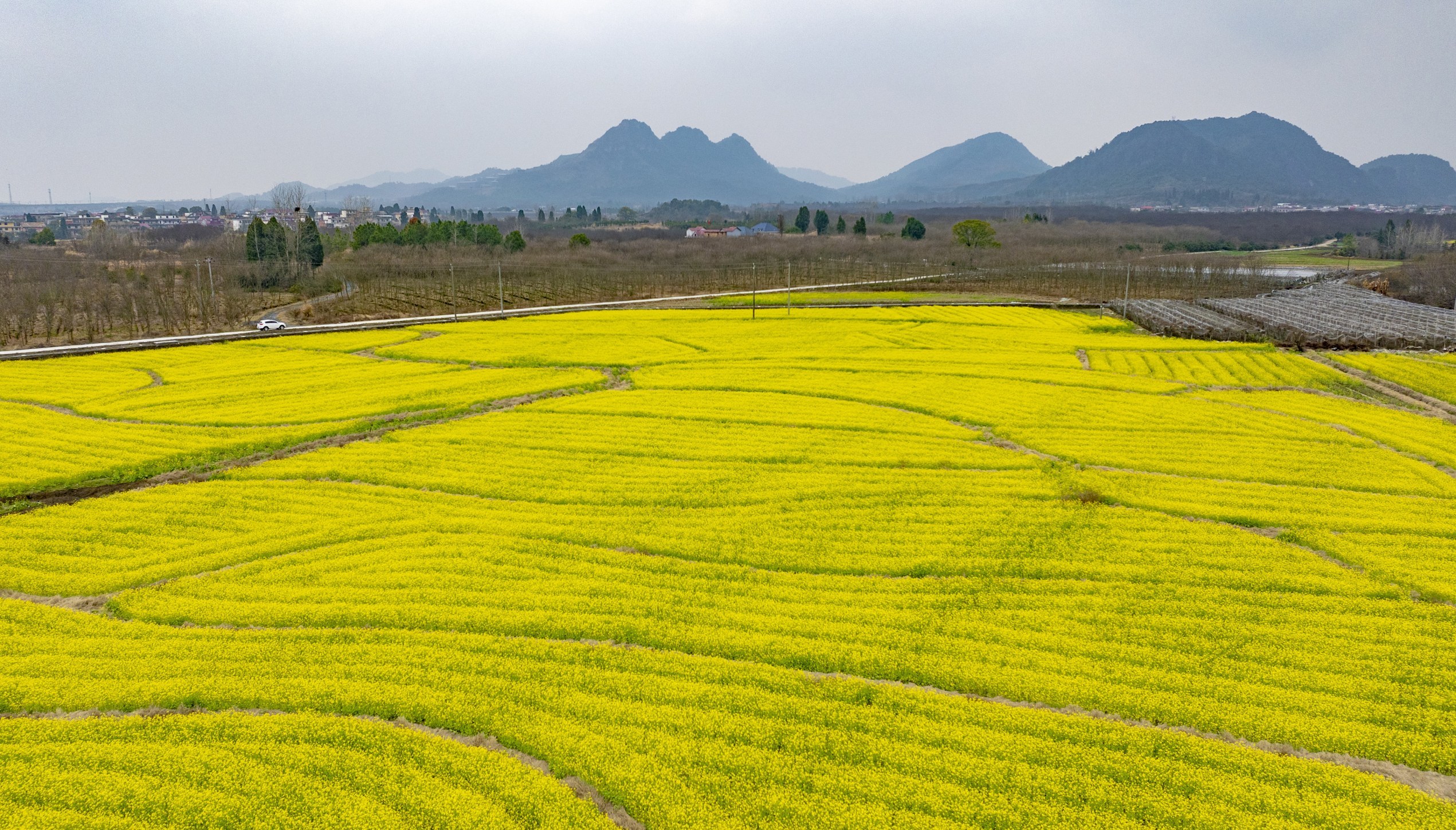 2月23日,仙女湖区欧里镇堎背村盛开的油菜花与远山、村庄、道路相互辉映,传递浓浓春意。本报记者 赵春亮摄
