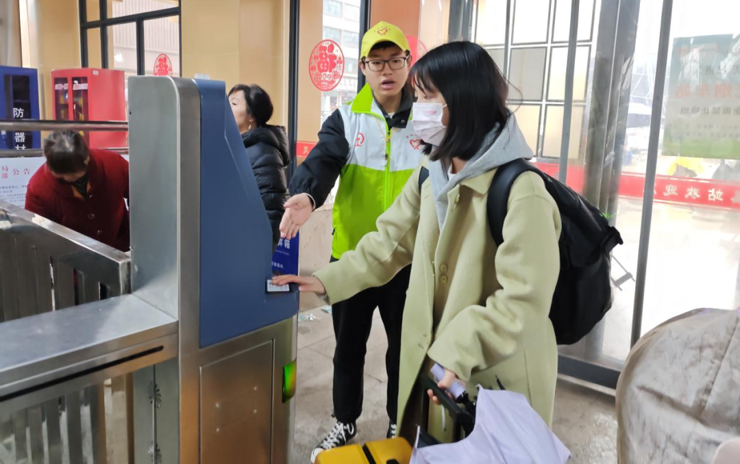 在候车大厅,志愿者们积极开展秩序维护工作,引导旅客按区域候车,提醒旅客保管好个人财物,还为有需要的旅客提供热水等贴心服务。发现带着孩子的母亲或残疾人随身行李较多时,志愿者们赶忙上前帮忙,并为他们找到候车位置。