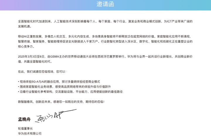 邀请函显示,此次华为将聚焦5G-A与AI的融合应用;围绕家庭智能化业务场景,提供高品质网络体验;沿着行业智能化参考架构,交流基础设施、平台能力、应用使能创新的最佳路径。