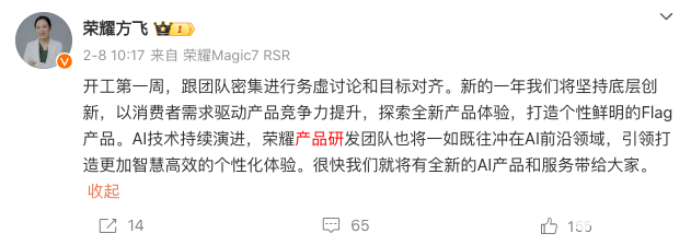 2024年2月初,荣耀产品线总裁方飞在社交平台发文称,“AI技术持续演进,荣耀产品研发团队也将一如既往冲在AI前沿领域,引领打造更加智慧高效的个性化体验。很快我们就将有全新的AI产品和服务带给大家。”