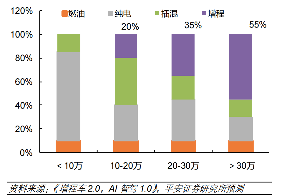 而相对同样内置传统发动机的插电混动车型来说,增程车除了可以免于充电所带来的不便,还在高端化方面走在前列。如下图所示,平安证券预测的不同价位乘用车渗透率上,在30万元以上车型中,增程的渗透率明显领先插混和纯电。当然这些预测都是远期的情况。
