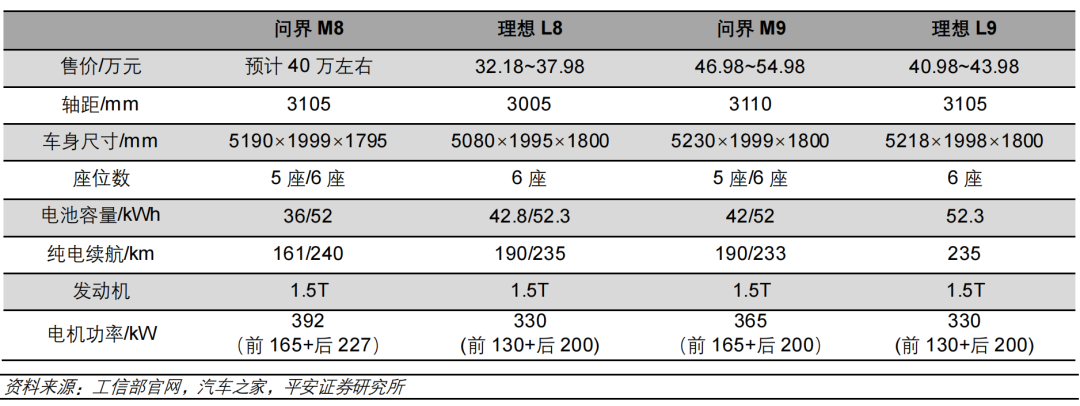在销售成绩同时向好的背景下,这两家车企非常值得拿来对比。如下图所示,两家销售的主力车型不管在车型定位、定价还是在同样都“死磕增程”的技术标准上,都是“直球对决”。