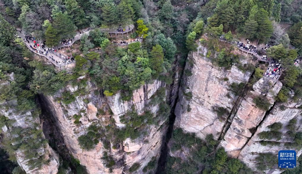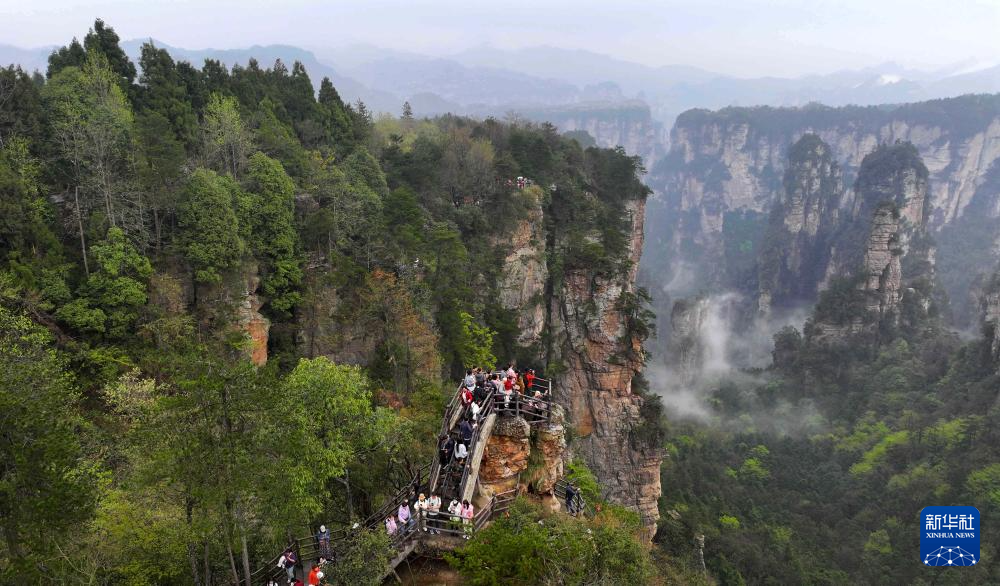 2024年4月11日,游客在张家界国家森林公园黄石寨景区游览(无人机照片)。