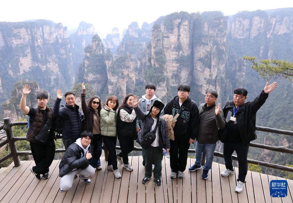 2025年2月15日,韩国游客在张家界国家森林公园袁家界景区游玩。