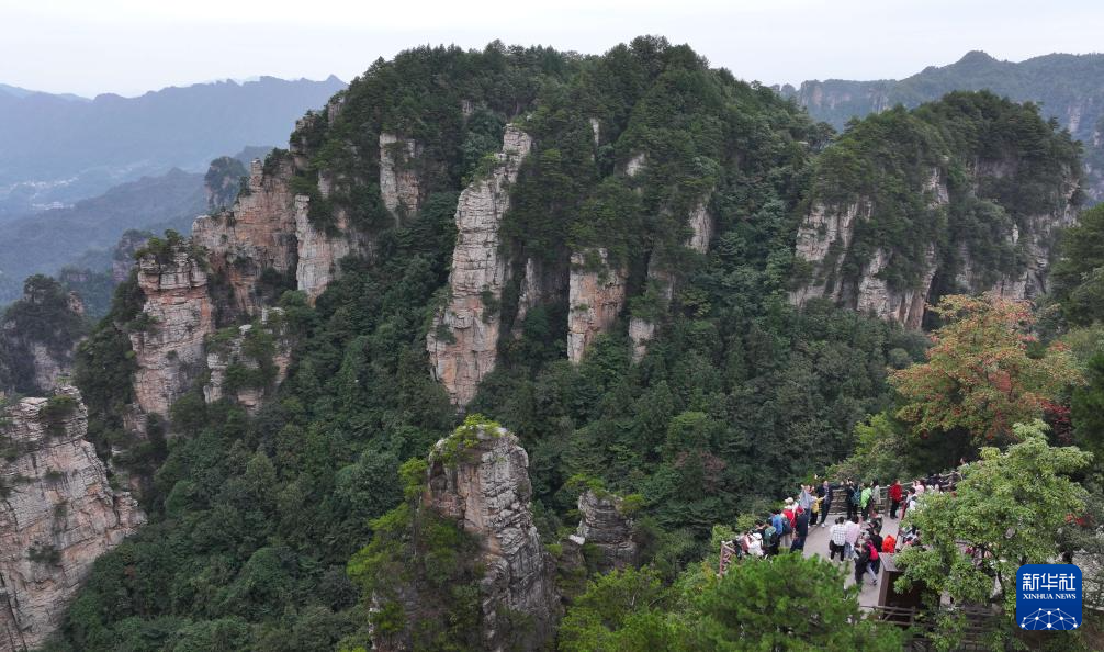 2024年10月3日,游客在张家界国家森林公园游览杨家界峰墙(无人机照片)。