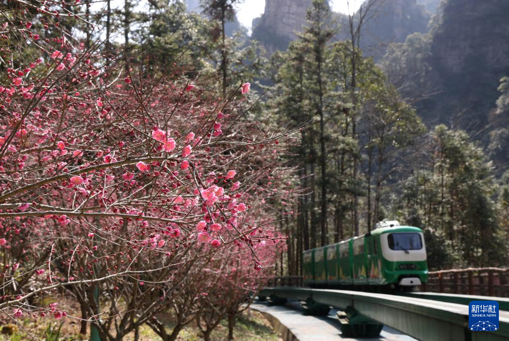 2025年2月15日,游人在张家界国家森林公园十里画廊乘观光电车游玩(无人机照片)。