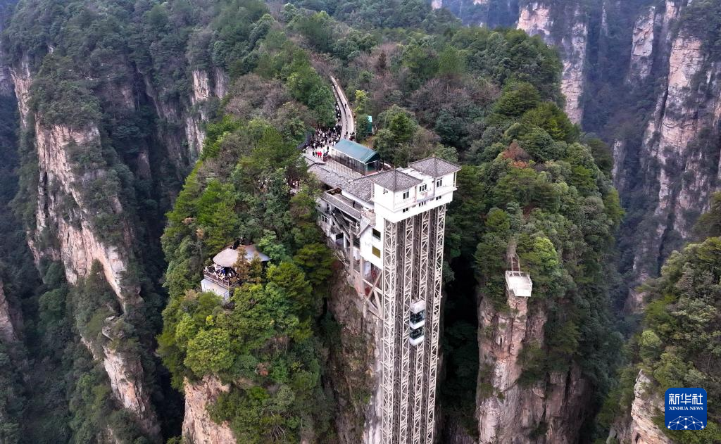 2025年2月5日,游客在张家界国家森林公园袁家界景区游玩(无人机照片)。
