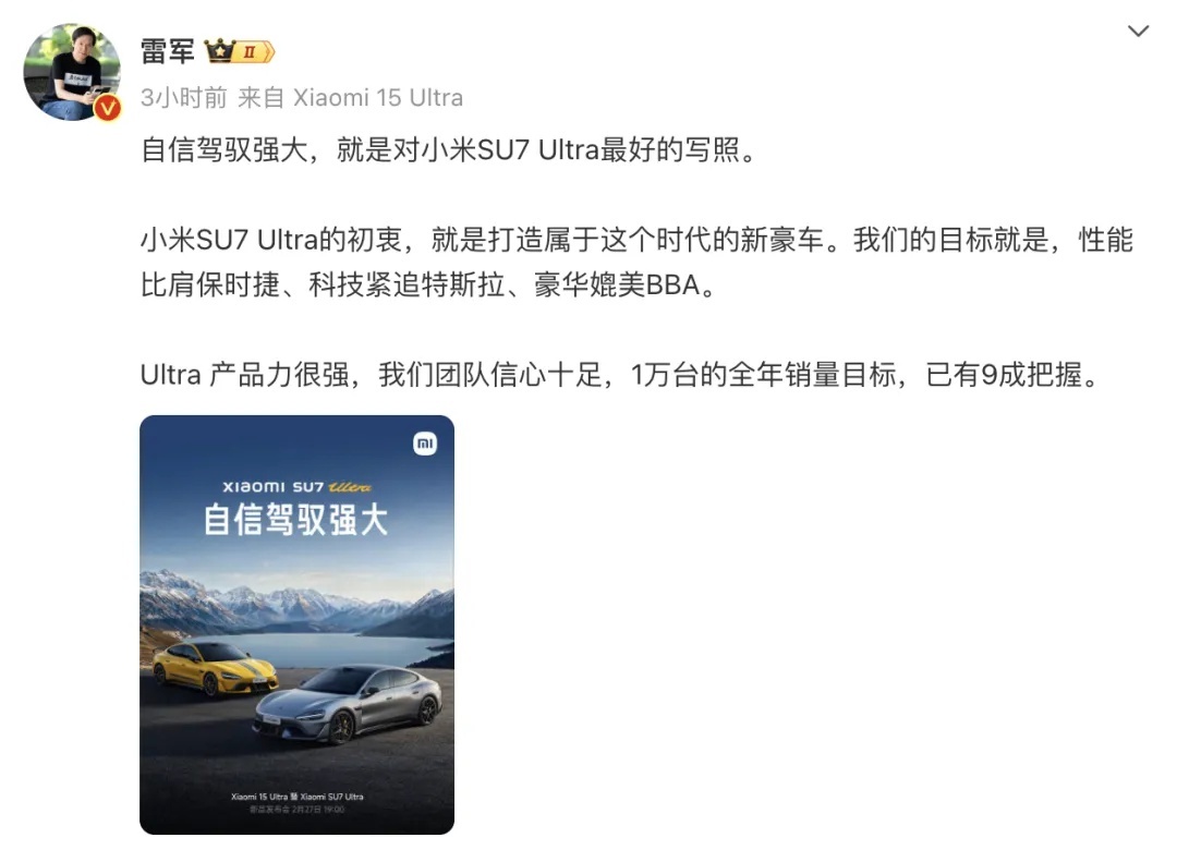 对于SU7 Ultra,雷军很有信心,他表示:“我们的目标就是,性能比肩保时捷、科技紧追特斯拉、豪华媲美BBA。Ultra产品力很强,我们团队信心十足,1万台的全年销量目标,已有9成把握。”