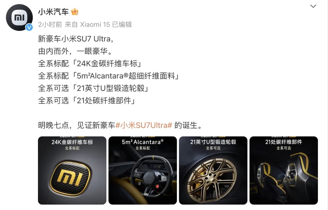 此前,@小米汽车 还宣布小米SU7 Ultra汽车全系标配24K金碳纤维车标、全系可选21英寸U型锻造轮毂、全系可选21处碳纤维部件、全系标配5㎡ Alcantara超细纤维面料。