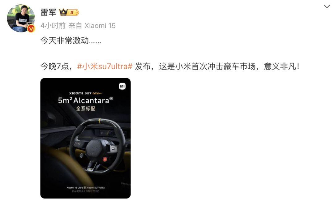 今日早些时候,雷军发文称“今天非常激动”,并表示今晚7点的发布会是小米首次冲击豪车市场,意义非凡。