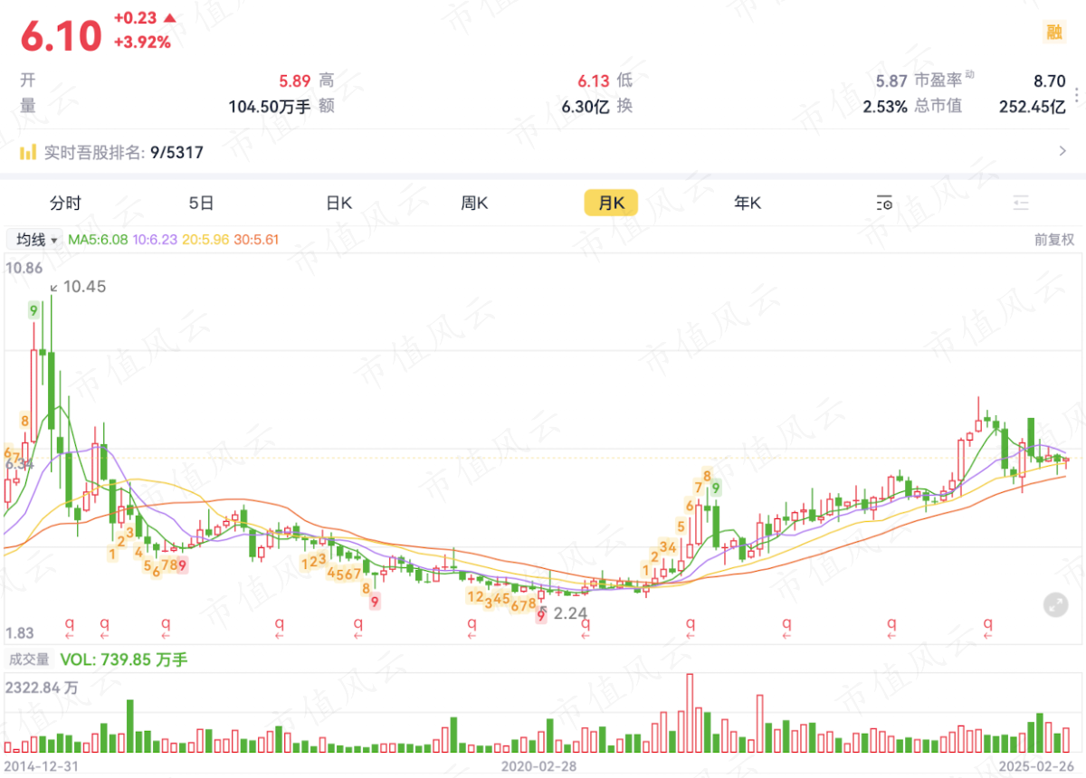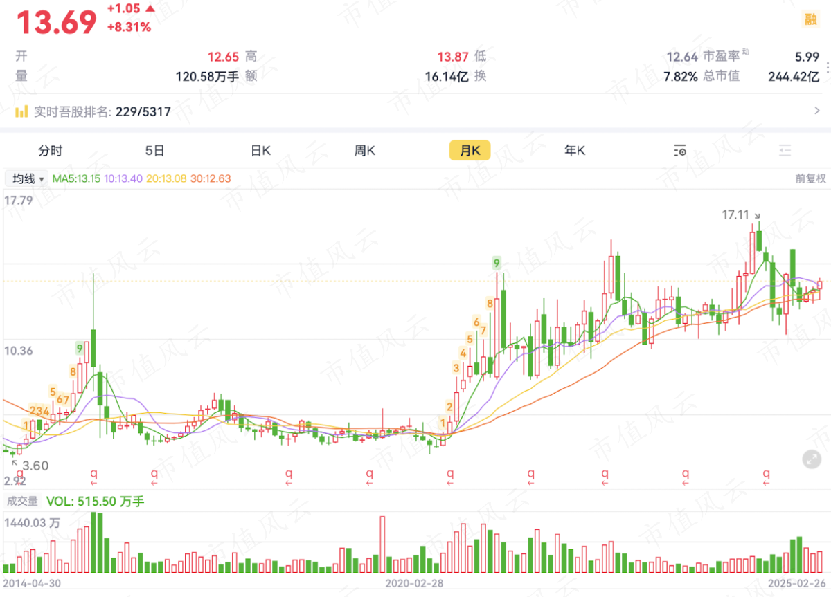 但是股价基本没涨,2月26日市值只有244亿,动态市盈率不到6倍。