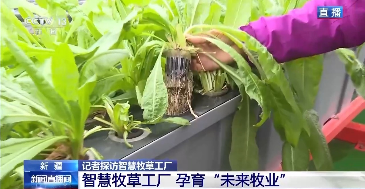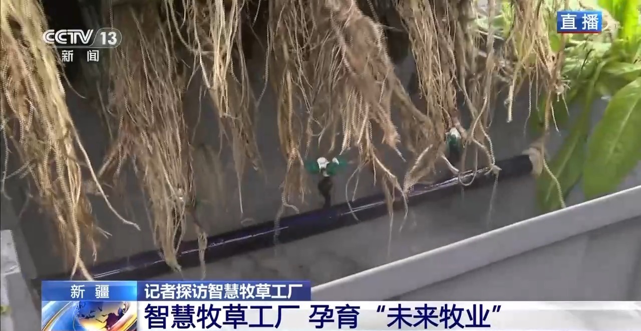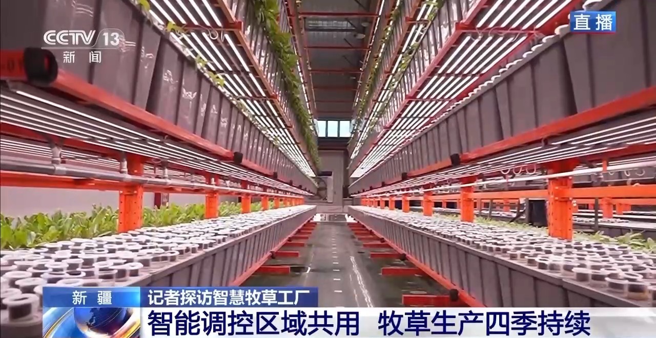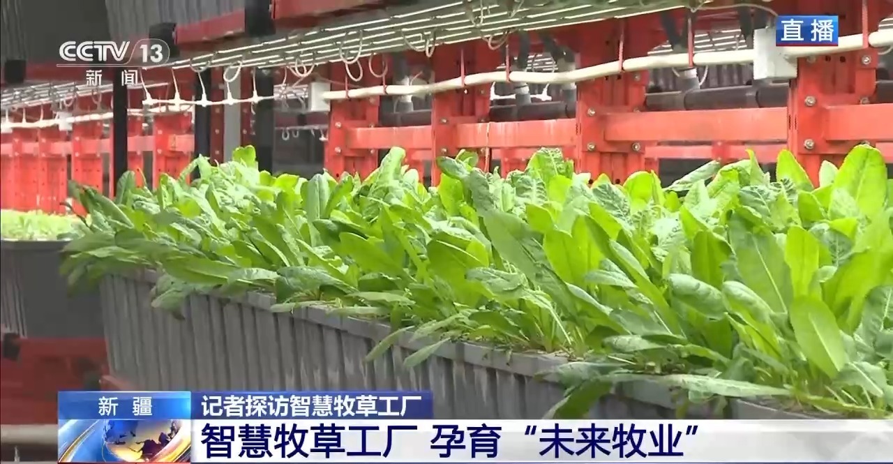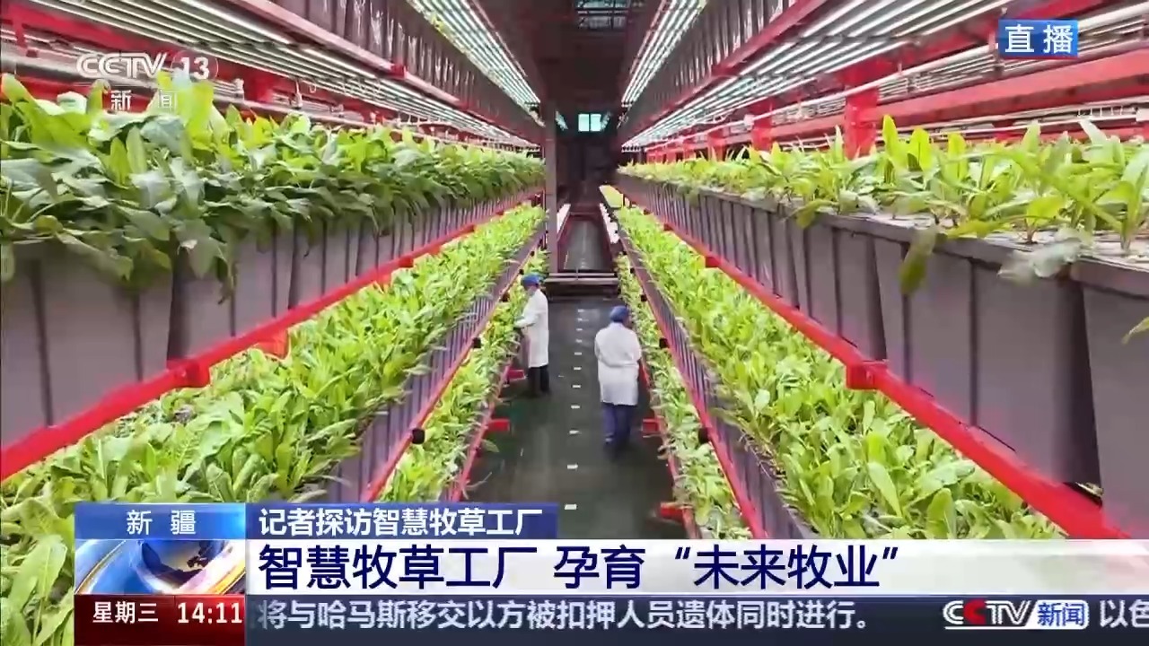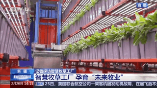 总台记者 崔宁:说到牧草,大家会想到一望无际的大草原,会想到风吹草低见牛羊的千里沃野,但我现在所在的新疆图木舒克市智慧牧草工厂里看到的是另外一番景象,厂房里没有土壤,没有四季轮回,牧草却在这里生长得郁郁葱葱,而且看起来它的叶片也非常壮实。