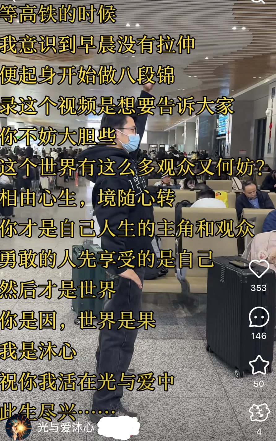 “打工人平时在高铁上一坐坐半天,不是玩手机就是闭眼睡觉,结果玩也玩不好睡也睡不着,一趟下来腰酸腿疼。但如果把坐高铁的时间利用起来健身,就能稍微缓和一下身上的酸痛。实在觉得不好意思,也可以直接在座位上原地冥想,既不会打扰别人,也给自己做了一次精神按摩。”