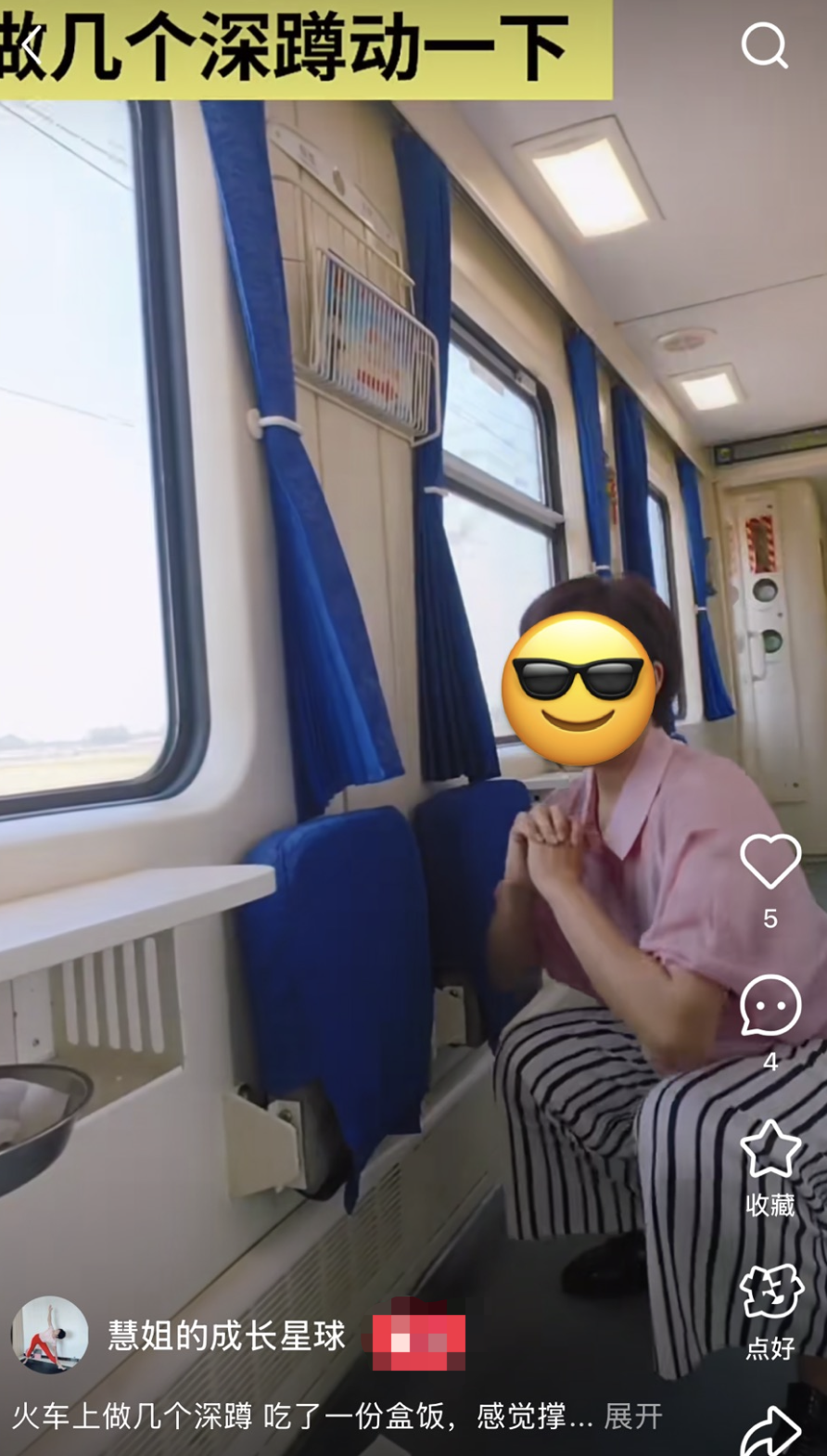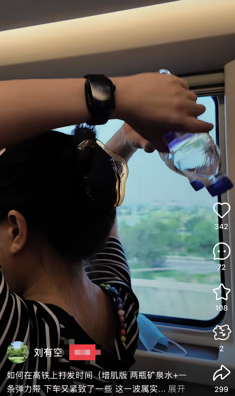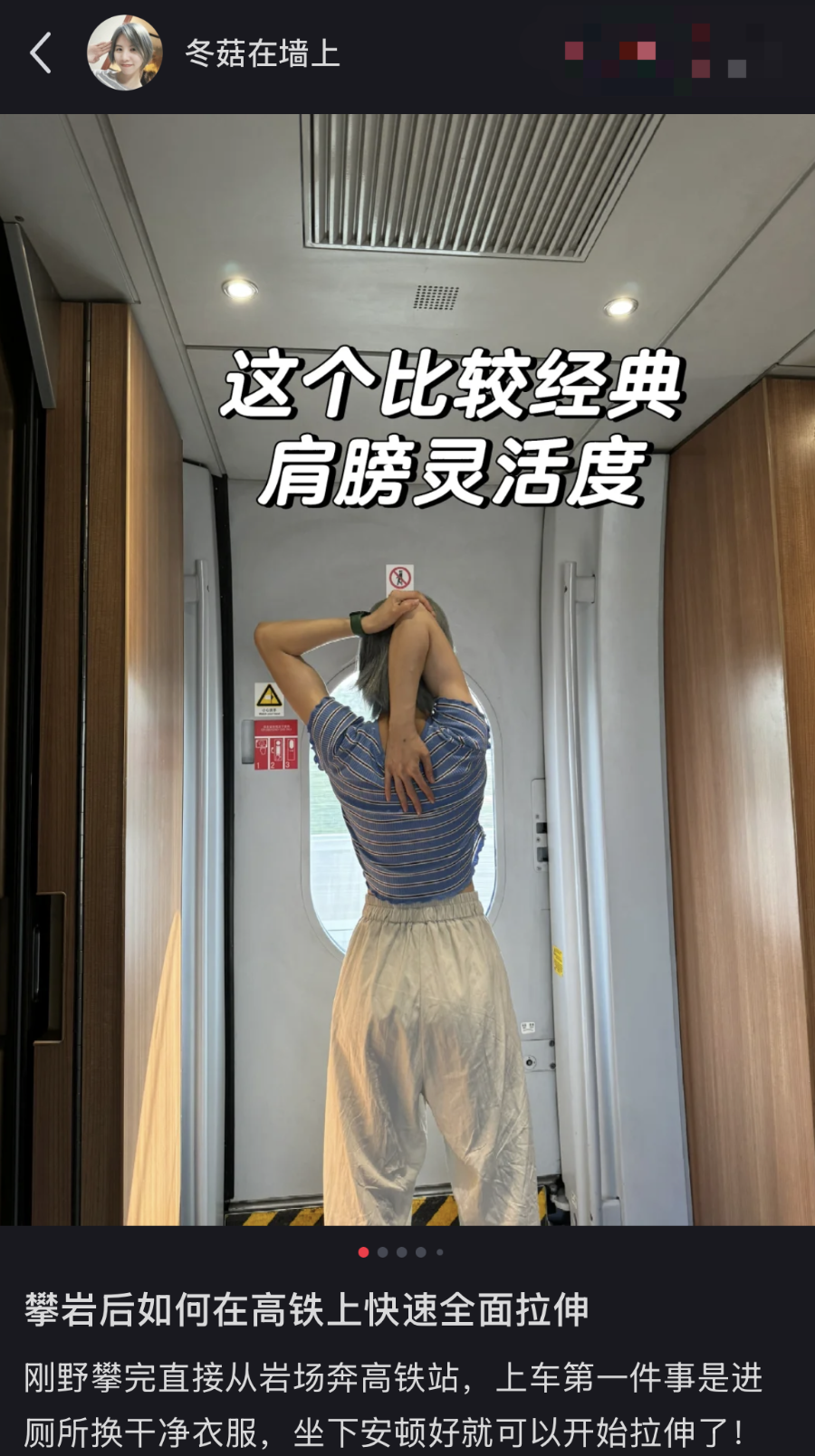 “毕竟去健身房,总有种花钱买罪受的感觉,但在高铁上健身,心态便会从‘被迫锻炼’变成‘带薪运动’,瞬间就有了动力。而且高铁空间有限,大部分健身动作幅度都不大,基本是在座位上抬腿拉伸、用拉力带活动肩颈,即便站起来也只是原地扎马步或稳稳深蹲。这些低强度运动,更加适合久坐成疾的打工人。”