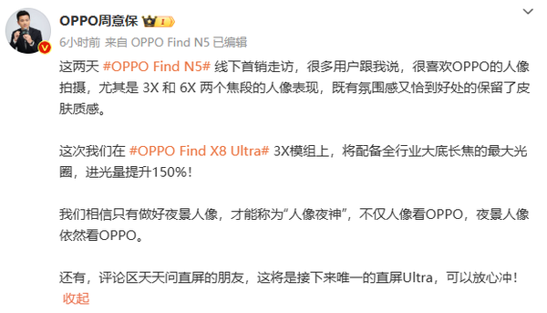 OPPO Find系列产品负责人@OPPO周意保称,移动影像公认的“珠峰级”挑战,就是夜景。而OPPO Find 8 Ultra将搭载3X模组,配备全行业大底长焦的最大光圈,进光量提升150%。他强调,无论是拍摄人像还是夜景人像,OPPO都是用户的首选。