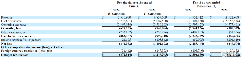 招股书显示,2022年、2023年、2024年1-6月,索芙特的收入分别约1952.17万美元、1495.24万美元、 551.10万美元,对应的净利润分别约-44.95万美元、-228.54万美元、-84.14万美元。