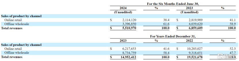 2022年至2023年,索芙特的网上零售收入从约1020.3万美元下滑至621.77万美元,占比也从52.3%降至41.6%。2024年上半年,索芙特的网上零售收入也同比下滑,占比进一步降至38.4%。